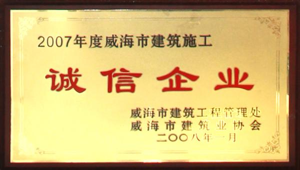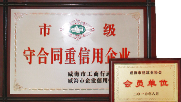 公司連續(xù)八年榮獲威海市“誠信開發(fā)企業(yè)”、“建筑施工誠信企業(yè)”,連續(xù)九年被評為威海市級“守合同重信用企業(yè)”,多次被評為威海市“市級文明單位”、“質(zhì)量管理先進(jìn)企業(yè)”、 “安全管理先進(jìn)企業(yè)”,乳山市“優(yōu)秀企業(yè)”、“先進(jìn)民營企業(yè)”、“納稅明星企業(yè)”,在社會(huì)上逐步樹立了誠信、穩(wěn)健的企業(yè)形象。
